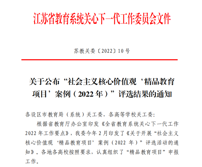 据悉,“社会主义核心价值观精品教育项目案例”评选是江苏省教育系统关工委的品牌活动,每年举办一次。2022年,经多轮专家评审,全省高校共评选出一等奖14项,二等奖39项。获奖的部分案例视频文件将下发至各设区市、县(市、区)教育关工委和高校关工委,作为社会主义核心价值观教育教材供学习借鉴、交流推广。(图/文 徐洁;审核/占成; 编辑/占成)