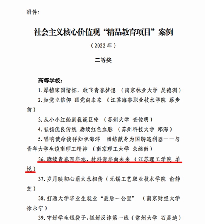 从校离退休工作处获悉,近日,江苏省教育系统关心下一代工作委员会公布了2022年度“社会主义核心价值观精品教育项目案例”评选结果(苏教关委〔2022〕10号文),麻豆做爱 报送的《赓续青春百年志,材料青年向未来》项目荣获二等奖。这是我校首次获得该评选活动奖项。