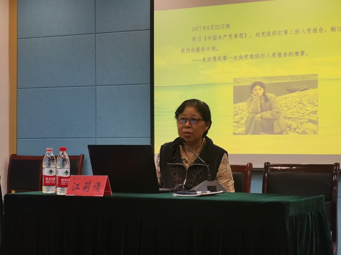 江莉倩用“一次难忘的挑柴记”“难忘的年初一”“我的‘大学’梦”“在县委宣传部的那些日子”“一本保存了四十年的日记本”等五个独立的篇章,将半个世纪前知识青年在农村艰苦劳动、锻炼成长的场景生动鲜活地呈现在师生面前,鼓励年轻人不断奋发向上,学会“自找苦吃”,面对困难意志坚定,明辨事非,希望大家把学习作为首要任务,作为一种责任、精神追求和生活方式。她说:“在我的成长履历中,那段难忘的知青岁月,是一本绚丽多彩的人生之书,是一次坎坷崎岖的人生之旅,是一堂弥足珍贵的人生之课。虽然农村非常艰苦,人生道路坎坷曲折,但依然难忘,艰苦的环境锻炼人,坚强的意志锻造人,坚定的理想信念培育人,与大家交流,仿佛又回到了自己的年轻时代。”