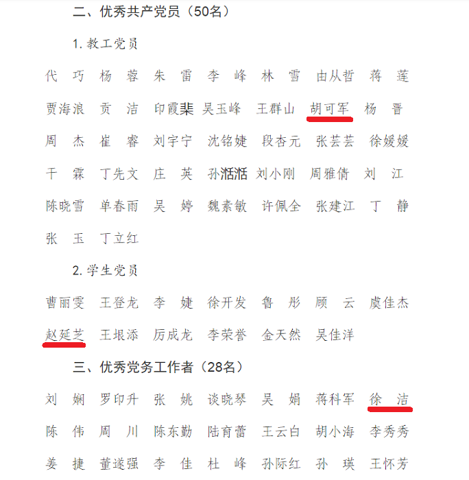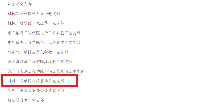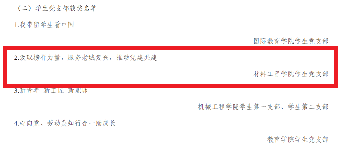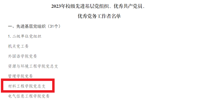 在2023年全校“七一”表彰大会上,学院党总支、材控基础系党支部分别作为二级单位党组织和基层党支部获评2022年度校先进基层党组织,教工党员胡可军、学生党员赵延芝获评优秀党员,院党总支宣传委员、学生党支部书记徐洁获评优秀党务工作者,学生党支部申报的主题党日活动《汲取榜样力量,服务老城复兴,推动党建共建》获校2022年度最佳党日活动评选(学生党支部组)优胜奖第二名。