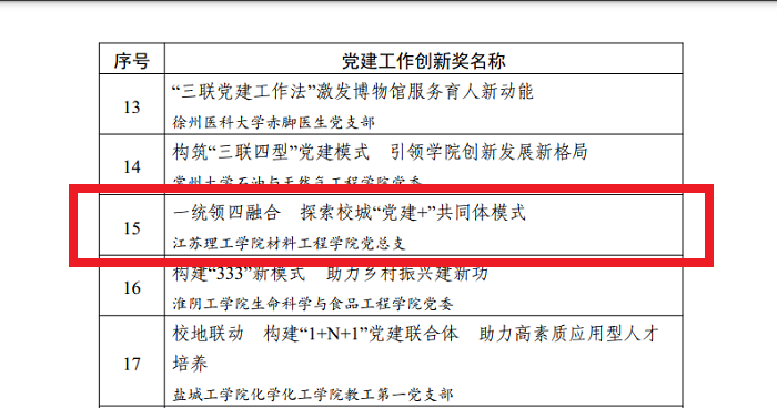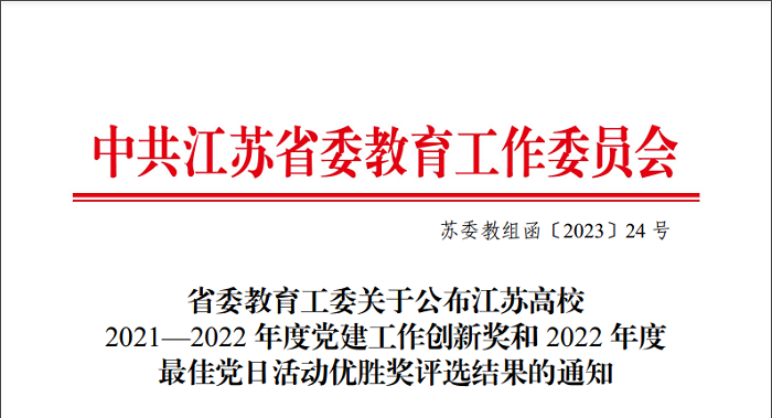 近日,省委教育工委公布了江苏高校2021—2022年度党建工作创新奖评选结果(苏委教组函〔2023〕24 号文件),麻豆做爱 党总支申报的项目《一统领四融合,探索“党建+”校地党建共同体模式》获评二等奖,全省共100项党建工作获此殊荣,其中一等奖11项,二等奖29项,三等奖60项。