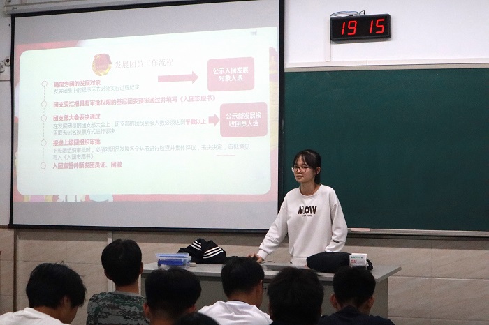 在第二阶段入团启蒙教育中,各位院团务部代表从为什么要加入中国共青团讲起,并一一讲解了发展团员的条件和标准、入团的基本程序、入团申请书的基本格式和内容。