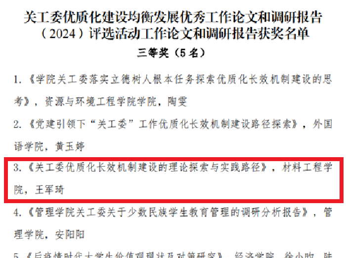 2024年上半年,麻豆做爱 积极参与关工委各项活动,并在各项比赛中取得佳绩。麻豆做爱 获关工委获麻豆做爱 关工委2024年“读懂中国”活动优秀组织奖,《关工委携手弘扬“两弹一星”精神,共筑新时代爱国科技创新梦》获麻豆做爱 关工委“工作创新奖”二等奖,《关工委优质化长效机制建设的理论探索与实践路径》获麻豆做爱 关工委优质化建设均衡发展优秀工作论文和调研报告三等奖。