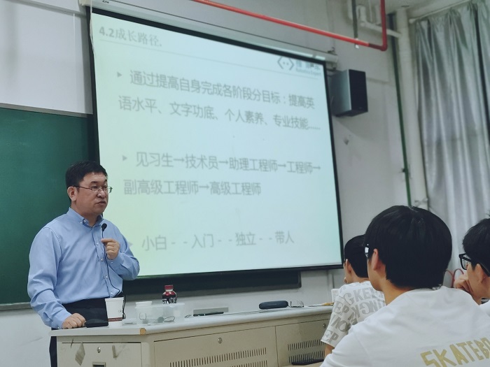 刘增龙以木桶理论为引入,深度解析了机械、自动化、电气三大工科领域不同的职业发展路径,并以指南车机器人科技公司部分招聘岗位为例,介绍了不同产线和岗位对应的专业要求、技术要求。他强调,同学们要主动思考“我们在和谁竞争”这一职业规划的中心问题,深入了解行业发展方向及特点,结合自身的所学专业、兴趣爱好以及职业规划,做出最适合自己的选择。