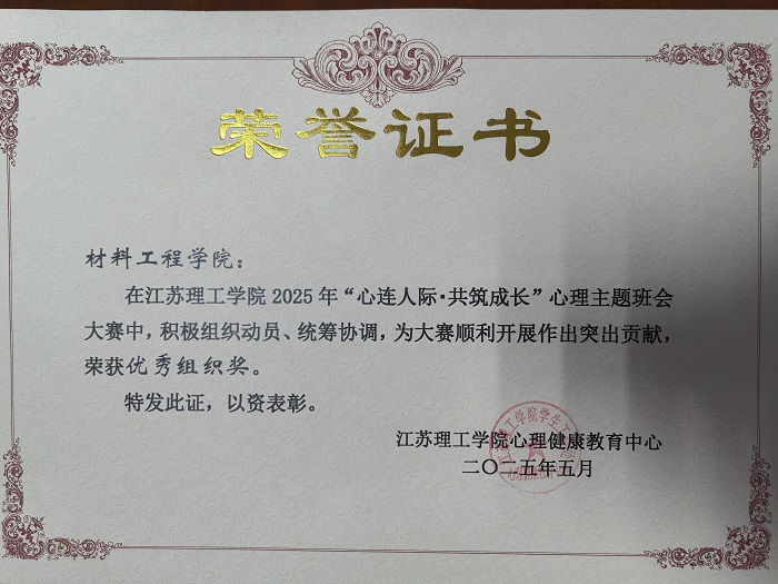 在校2025年“心连人际·共筑成长”心理主题班会大赛中,麻豆做爱 积极组织动员、精心策划,统筹协调,荣获“优秀组织奖”。体现了麻豆做爱 心理健康教育工作的积极投入与创新实践,为营造积极阳光的班级氛围奠定了坚实基础。