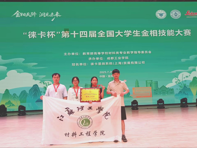 7月25至30日,第十四届全国大学生金相技能大赛在成都工业学院宜宾校区落幕。经过指导教师前期理论及操作培训,校赛、省赛选拔以及国赛555所高校的2000余名选手激烈角逐,我校23金属1班杜江威、23材控3Z班丁思语、23材控3Z班叶如梦3人分别获实验技能赛道全国二等奖,23增材陈浩粼、23材控3Z班谢俊实2人分别获实验技能赛道全国三等奖,团队获全国团体三等奖;王健老师获大赛优秀指导教师,再次为我校取得了荣誉。全国大学生金相技能大赛连续6年入选《全国普通高校大学生竞赛分析报告》榜单,是材料类专业规格最高、制度最健全、规模最大、影响最广泛的全国性大学生学科赛事,旨在通过“以赛代练”提升学生专业技能、工匠精神和科学素养,引导大学生努力成为精于一技、专于一业的高素质人才。