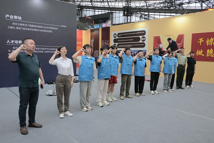 展览现场,东风-21D导弹装载车、歼-20战斗机、神舟飞船返回舱等“国之重器”实物与模型震撼亮相,生动再现了我国航空航天事业从无到有、由弱到强的奋斗历程。师生们直观感受国家科技实力的跃升,进一步坚定了 “科技报国、材料强国”的信念。院党委副书记占成带领师生党员重温了入党誓词。