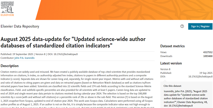 据悉,该榜单是目前全球最具权威性的学者评价体系之一,以Scopus数据库的引用数据为核心依据,综合引用次数、H 指数、HM 因子等 6 项核心指标进行评估。从 22 个学科领域、176 个细分领域的近 700 万名科学家中遴选出排名前 2% 的顶尖学者。榜单同时设置“终身科学影响力(Career-long Impact)”与“年度科学影响力(Single-year Impact)”两类维度,分别衡量学者在职业生涯中的综合学术贡献与近期研究成果的影响力。