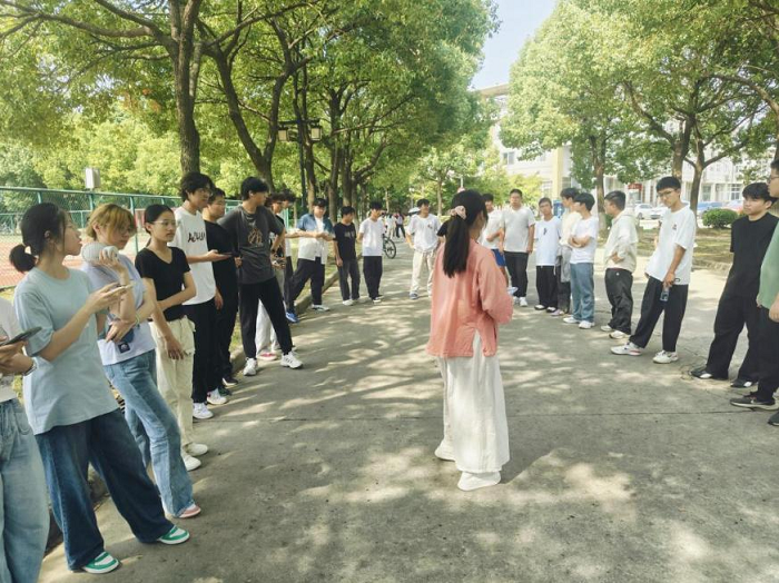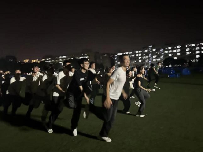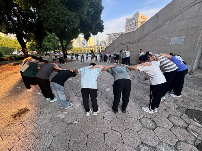 在“勾肩搭背操”环节,新生先按身高与力量特点排位,后一位同学轻抓前一位同学的脚后跟衣物,伴随“一二、一二”的统一口号保持跳跃节奏——有人脚步不稳时,身边同学及时提醒调整,让大家直观体会“集体力量大于个体之和”。