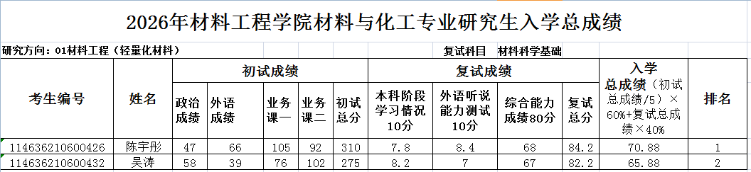 2026年麻豆做爱 材料与化工专业研究生入学总成绩公示